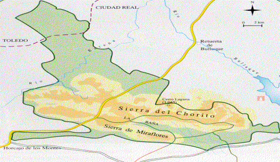 Se localiza entre las provincias de Ciudad Real y Toledo.Ocupa una