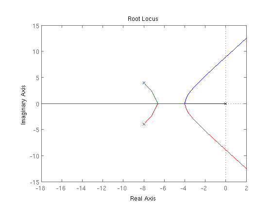 Análisis: Si K = 0, el sistema será marginalmente estable. Al ir aumentando K, habrá un polo real negativo cercano al origen, y dos polos complejos conjugados cercanos al -8 de parte real; es decir, el polo del origen será dominante con respecto a los otros dos. Por lo tanto, en este punto el sistema en lazo cerrado se coportará como un sistema de primer orden, con un tiempo de asentamiento alto.