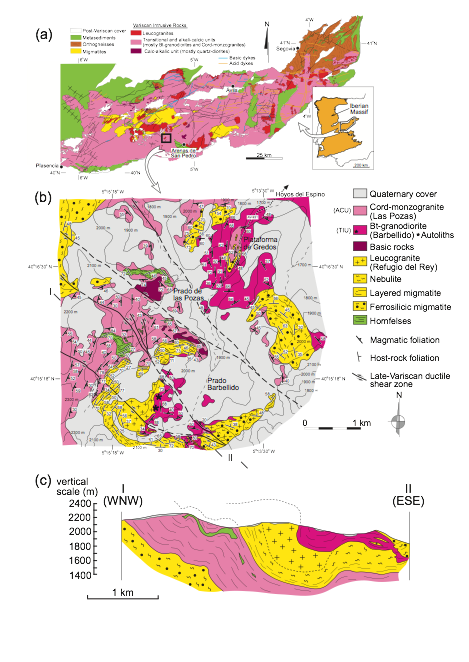 (a) Geological map of the Spanish Central System batholith. (b) Detailed geological map of the Barbellido-Las Pozas area (Sierra de Gredos, Central System batholith). Location in Fig. 1a. (c) WNW-ESE-trending geological cross-section showing the main structural features of the mapped area.