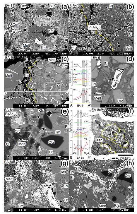 BSE images of experimental runs simulating the interaction between Bt granodiorite and potential mineral and rock contaminants. All experiments were carried out at 850 °C and 400 MPa. (a) Pelitic xenolith end-member. (b), (c) and (d) show the textures of runs with addition of Crd to the Bt granodiorite. (e) Texture and mineral assemblage of the run with addition of a Sil-rich spot to the Bt granodiorite. (f), (g) and (h) show the relations and minerals of the experiment with addition of a fragment of pelitic xenolith to the granodiorite. Compositional profiles of melts across the capsules are shown in (d) and (f).