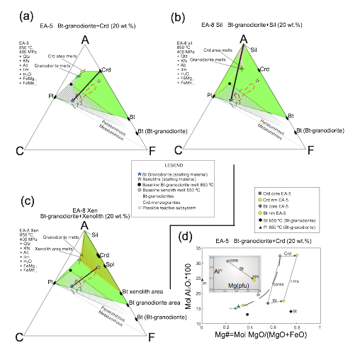 ACF projected diagrams (A=Al2O3; C=CaO; F=FeO) plotting the coexisting assemblages and melts of composite experimental runs with addition of Crd (a), Sil-rich spot (b), and xenolith (c) to the Bt granodiorite. Molar proportions of ACF are projected by algebraic inversion of the compositional space defined by the components A, C, F, Qtz, Kfs, Ab, Ilm, H2O and the exchange vectors FeMg-1 and FeMn-1. The area of reactive subsystems has been traced tentatively according to qualitative observations of textures in the runs. The thick line with tick marks is the bulk mixing line of the two systems represented by the Bt granodiorite and the contaminant. Tick marks represent 10 wt% proportions of one of the two end-members. The composition of Crd monzogranites is close to the mixing array using xenoliths as contaminants (c). (d) represents the constant slope of the Mg# partitioning between Crd and Bt supporting the shift in composition of the local system with time. Note that new-formed Bt, both in the granodiorite layer and the Crd-rich layer, is richer in Al with respect to the baseline represented by the Bt composition in the granodiorite alone. The four phase assemblage depicted in (a) and (c) indicates the peritectic reaction that that forms Crd at expense of Bt. The remaining melt in the granodiorite system alone at the same PT conditions (red circle) is very close in aluminosity to the melts formed in the composite capsules (green circles). These relations point to a potential equilibrium of Crd in the residual melt of a partially crystallized granodiorite.