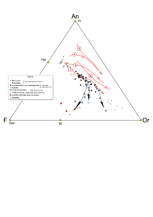 Projection of granitoids of the Gredos massif onto the pseudoternary projection defined by Opx-Or-An. Lines of multisaturation (cotectic like) are traced from experimental data with calc-alkaline systems. These represent liquid trajectories by either crystal fractionation or partial melting. Arrows mark the direction of decreasing T. Bt granodiorites of Gredos (grey circles) fairly follow the cotectic trend corresponding to liquids produced either by fractionation of an andesitic parental magma or by partial melting of a diorite solid source. Crd monzogranites follow a trend transversal to the general attitude of cotectic lines. The main transversal trend points to the composition of country rock pelitic xenoliths. These relations report that Crd monzogranites are resulting by bulk assimilation of pelitic metasediments by Bt granodiorite magma. Cotectic lines (1) and (3) correspond to experiments.