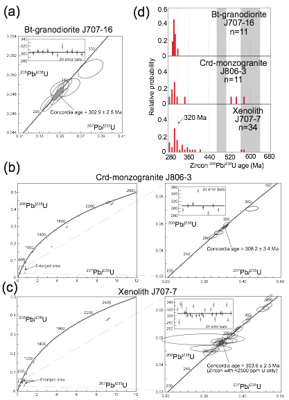 U-Pb Concordia diagrams and relative probability histograms for the three studied samples. Data-point error ellipses in Concordia diagrams are 68.3% conf., including error from standard, and include the 2σ error bars diagram for ages between 280 and 350 Ma. Grey colored rhombs are coherent groups of ages used to obtain mean Concordia age. (a) U-Pb Concordia diagram for Bt granodiorite (sample J707-16). (b) and (c) are Concordia diagrams for the analyzed samples of Crd monzogranite (sample J806-3) and xenolith (sample J707-7), respectively. An enlarged area plot for Variscan ages is also shown. (d) Relative probability histogram for 206Pb/238U ages (listed in Table 3). Grey areas mark main ages of the host sediments to the Central System batholith