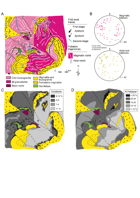 (a) Structural sketch of the area mapped in Fig. 4a. (b) Equal area, lower hemisphere projections of poles to the magmatic foliation and host-rock foliations in the mapped area. (c) and (d) Isocontour maps representing volume fractions of cordierite and K feldspar, respectively, in the granitoids of the mapped area.