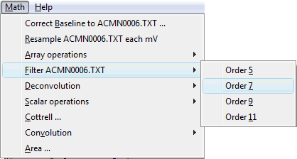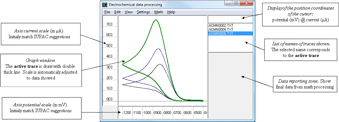The list of names of traces shown indicates the name of all data traces that the program is showing. If they are derived from data files, the name of the trace coincides with the file that was opened for loading. If you get as a result of treatment, the program assigns a name identifying the trace automatically. On this list you can choose the active trace by simply clicking his name with the mouse, this trace will be the subject of actions outlined in several of menu options.
