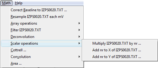 This action affects the active trace and as a reminder is added to the name of the Save menu title. Using this option can save data from previously opened files or data from changes made on them by mathematical treatment.