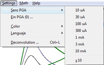 X and Y axes are scaled automatically according to the amplitude data shown in the graph window, an excess of 5% of the total size is added on each side for better visualization. The units are set forth in the case of representing voltammograms but can change if you represent cronoamperograms (X ms, and in μA) and absorption spectra (X in nm, and absorption in arbitrary units). In any case the original direction of the axes is growing up and right.