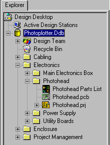 - Hacer clic sobre el símbolo + al lado del nombre del diseño en el árbol de navegación para expandir la carpeta, y luego expandir las carpetas Electronics y Photohead. Hacer clic en el icono Photohead Parts List para abrir el documento en la ventana de diseño. Hacer lo mismo con Photohead.pcb y Photohead.prj.