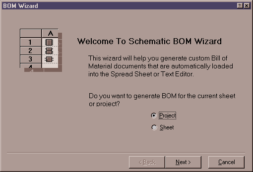 - Seleccionar Reports -> Bill of Material de los menús del esquemático para arrancar el asistente de Lista de Materiales (BOM Wizard). Este asistente nos permite realizar todos los pasos necesarios para generar una Lista de Materiales en formato texto, o como una hoja de cálculo compatible con Microsoft Excel.