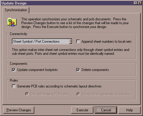- En el dialogo Update Design, dejar todas las opciones en sus valores por defecto y hacer clic en el botón Execute, el sincronizador de diseños analizará el esquemático y los documentos PCB y determinará cualquier diferencia entre ellos.