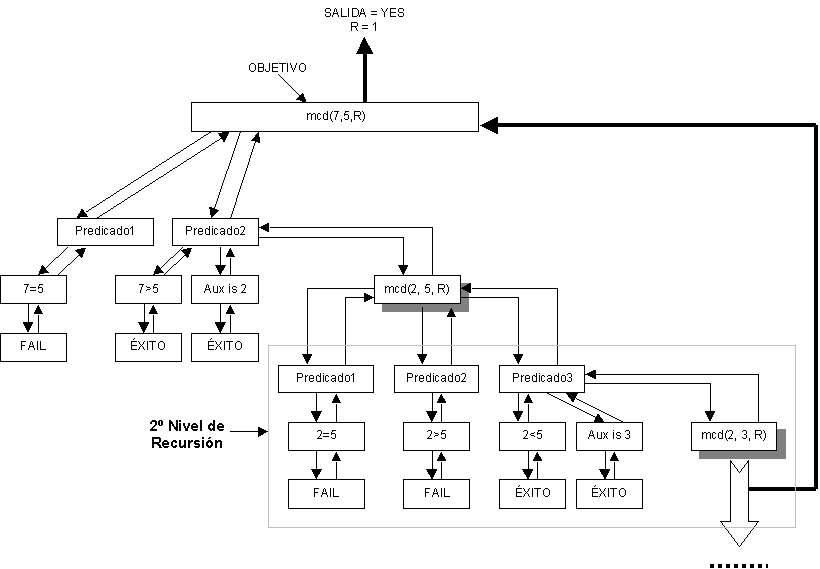 Para estudiar este ejemplo, vamos a utilizar el ejemplo del cálculo del máximo común divisor. Hemos de apuntar, que el proceso se realizará de la misma forma que en el caso anterior. Lo único que hay que tener en cuenta es que es necesario controlar el orden en que se colocan los predicados para evitar una ejecución no deseada, ya que toda solución recursiva debe evolucionar hacia el caso trivial.