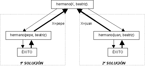 La traza del programa siguiente se muestra en la Figura 9. hermano(juan, beatriz). hermano(pepe, beatriz). Objetivos planteados ?.-hermano(X, beatriz). X->juan; X->pepe; no. |