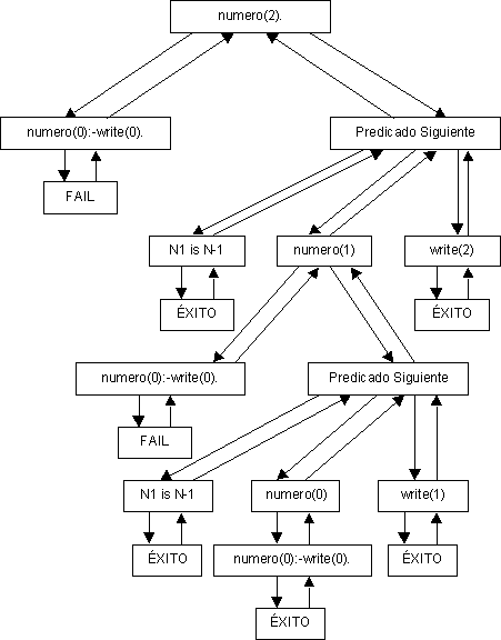Ya se ha comentado en puntos anteriores: Prolog utiliza un sistema de backtracking para resolver una meta propuesta. El procedimiento de backtracking consiste en generar un árbol de búsqueda de todas las posibles resoluciones que puede tener la meta en función de la base de conocimientos. Esto significa, que el algoritmo itera hasta que encuentra una solución. Cada vez que los predicados fallan y no son unificables se va generando una nueva rama hasta encontrar la solución deseada, de esta forma se va construyendo el árbol de búsqueda.