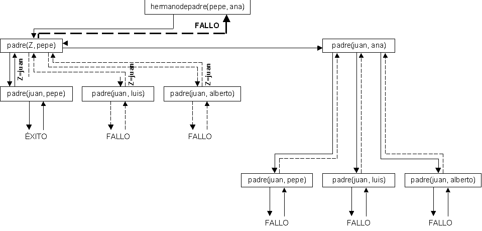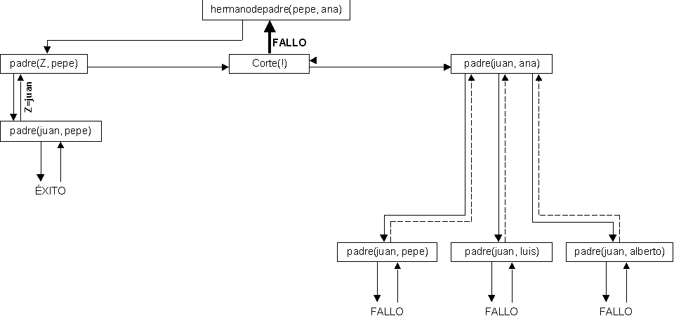 Como se observa en el árbol de ejecución, cuando falla el segundo predicado del consecuente, al hacer backtracking, ignoramos la solución obtenida para el primer predicado en la rama anterior, y buscamos una nueva solución, con la esperanza de hallar aquella que, posteriormente, satisfaga al segundo predicado. Sin embargo, nosotros sabemos, a priori, que dicha solución no va a ser posible, porque ya hemos demostrado que juan es el padre de pepe y no lo es de ana, luego ambos no son hermanos de padre, luego, en este caso, no interesa seguir buscando nuevos padres para pepe (esto sería absurdo e ineficiente). Por tanto, no es necesario desarrollar la rama de retroceso representada por la línea discontinua en la Figura 1.