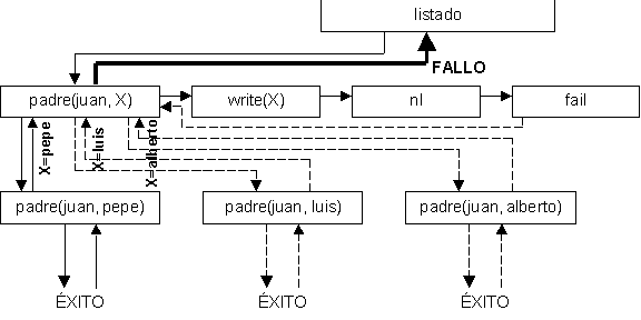 Base de conocimientos. padre(juan, pepe). padre(juan, luis). padre(juan, alberto). listado:-padre(juan,X), write(X), nl, fail. Objetivo ?.- listado. pepe luis alberto no. El proceso de ejecución se observa en la Figura 3 . |
