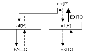 Para comprender la implementación de la negación nos vamos a fijar en la Figura 4, que muestra el funcionamiento del predicado cuando P es cierto y en la Figura 5, que muestra el funcionamiento cuando P es falso.