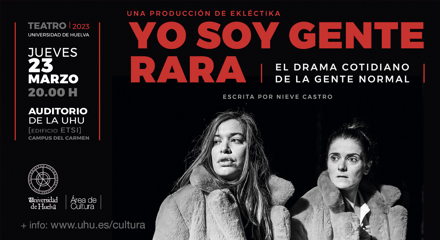 "Yo soy gente rara" de Nieve Castro Teatro Jueves 23 de marzo de 2023 - 20 horas YO SOY GENTE RARA El drama cotidiano de la gente normal De Nieve Castro Auditorio... 23/03/2023 Auditorio de la UHU. Edificio Escuela Técnica Superior de Ingeniería. Campus del Carmen
