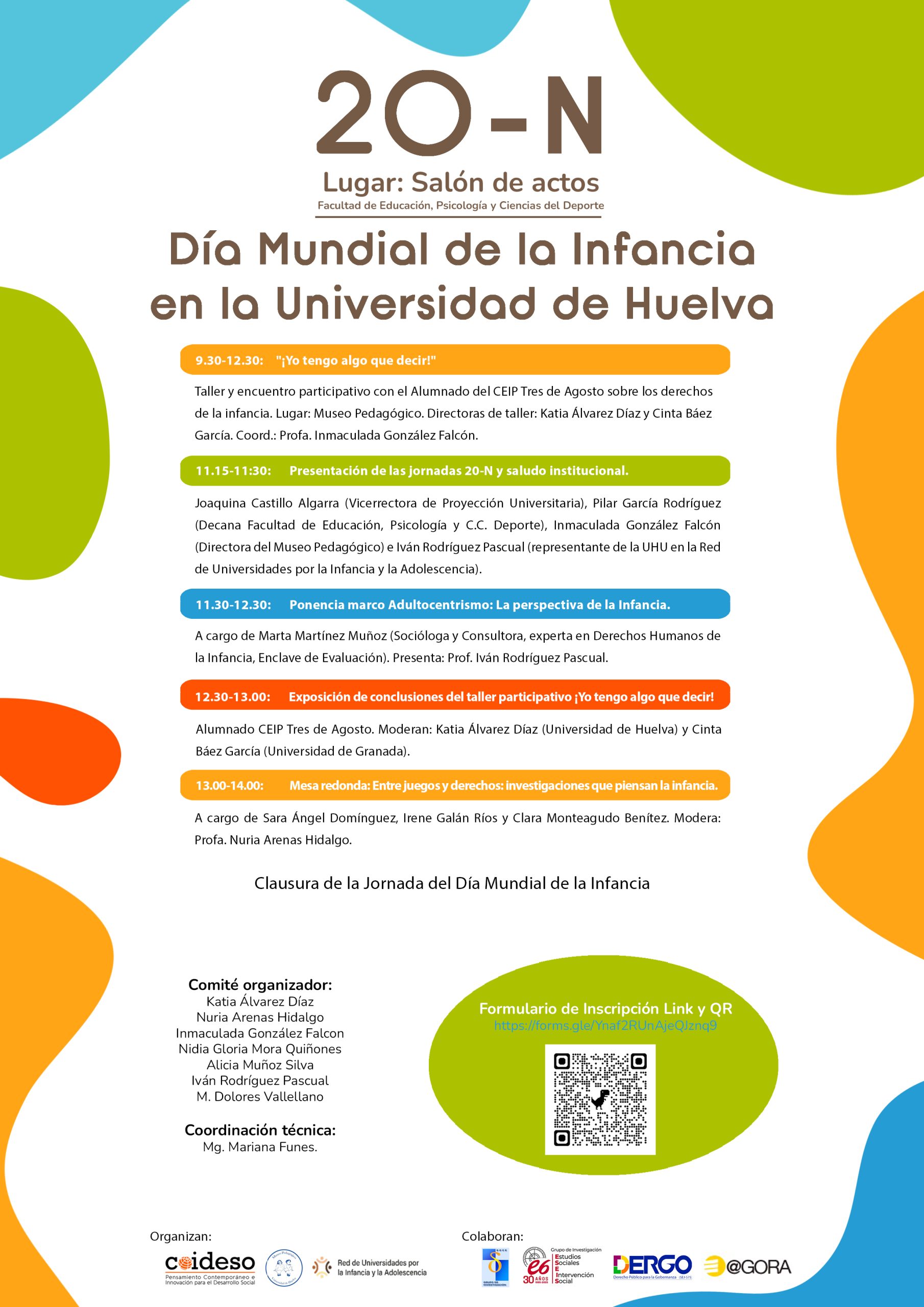 Con motivo de la conmemoración del Día Mundial de la Infancia, la Universidad de Huelva junto a Coideso organizó una completa jornada centrada en el paidocentrismo y en la puesta en valor del pensamiento infantil. La celebración comenzó con la participación de los verdaderos protagonistas del día: las niñas y los niños del Centro Público de Educación Infantil y Primaria Tres de Agosto, a quienes el centro de investigación agradeció profundamente su implicación, así como la de su profesorado, cuya dedicación ha hecho posible esta actividad.