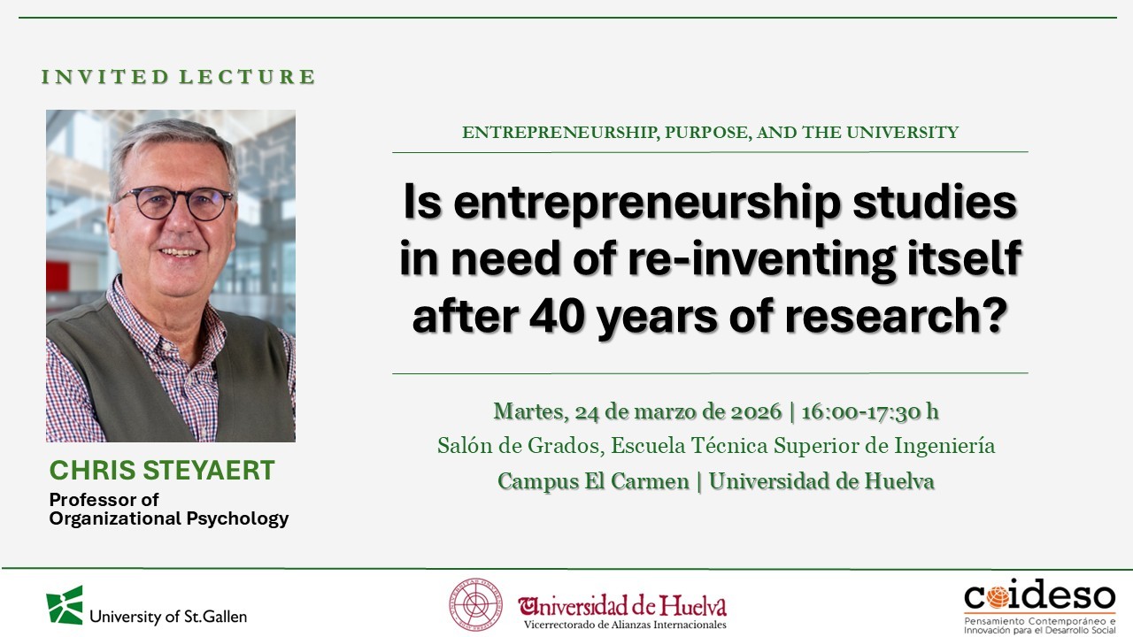 El próximo martes 24 de marzo, de 16:00 a 17:30 horas, el Salón de Grados de la Escuela Técnica Superior de Ingeniería acogerá la conferencia “Is entrepreneurship studies in need of re-inventing itself after 40 years of research?”, impartida por el profesor Chris Steyaert.