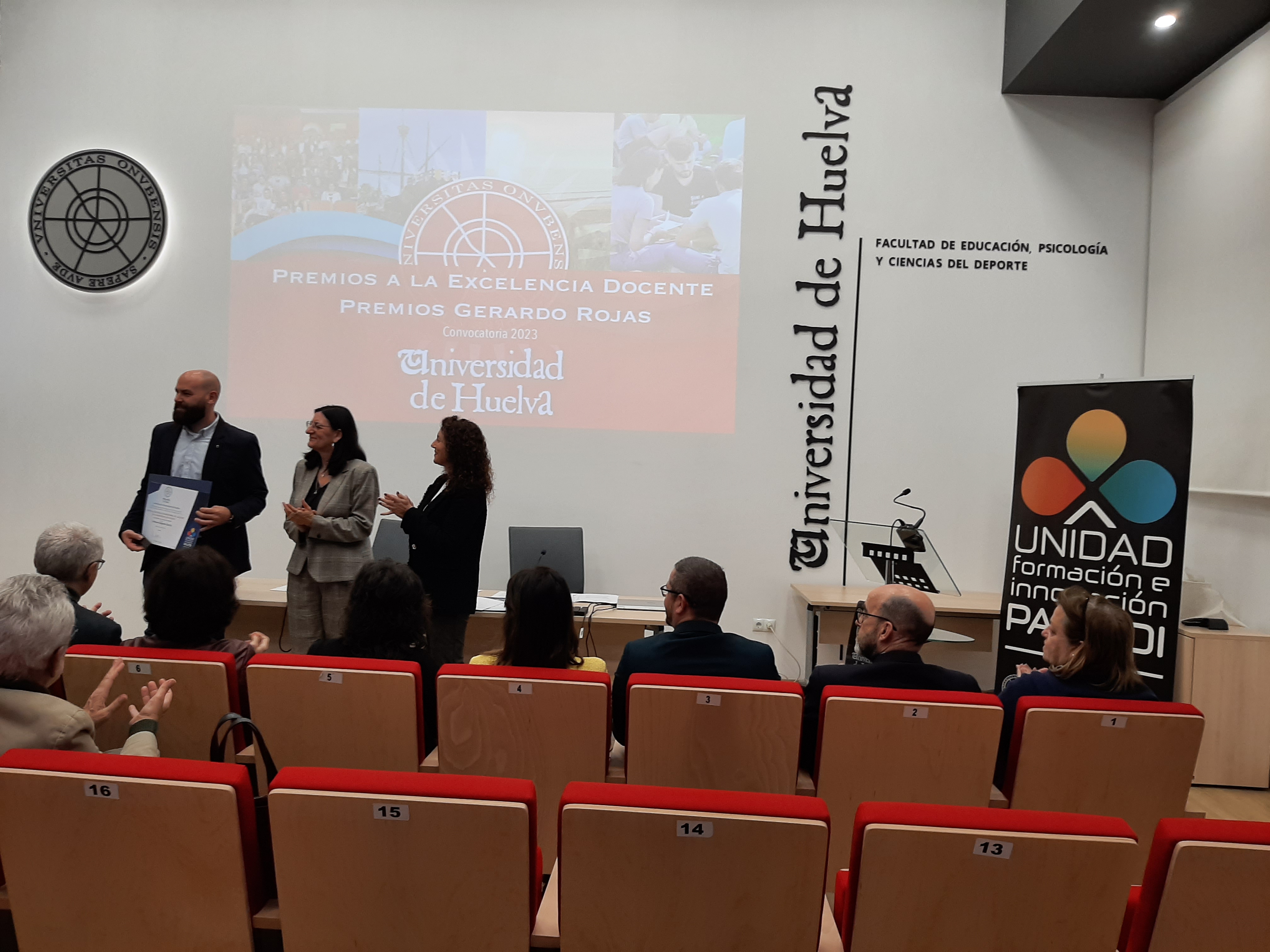 Acto de entrega de los Premios a la Excelencia Docente de la Universidad de Huelva 2023 y de los Premios "Gerardo Rojas" que tuvo lugar el 15 de febrero a las 10:00 horas, en el Aula de Grados de la Facultad de Educación del Campus El Carmen.