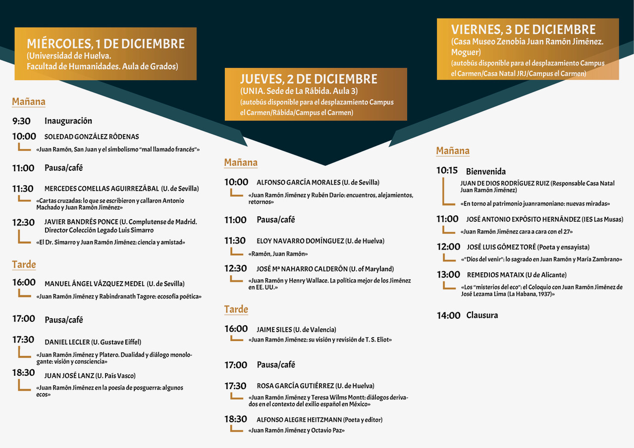 En conmemoración del 140 aniversario del nacimiento de JRJ, la Cátedra Juan Ramón Jiménez ha organizado el Simposio Internacional Juan Ramón cara a cara: diálogos poéticos, políticos e intelectuales, que se celebrará los días 1, 2 y 3 de diciembre de 2021 en la Universidad de Huelva, la UNIA (sede La Rábida) y la Casa Natal de Juan Ramón Jiménez en Moguer.