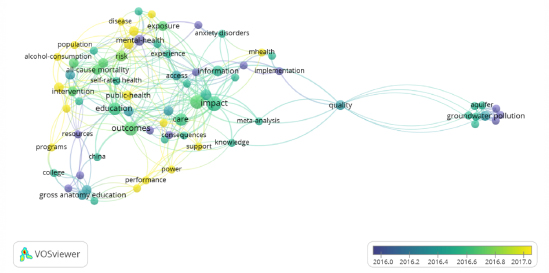 De la totalidad de los documentos identificados, se establece un análisis en función de la temporalidad para determinar cuáles son los conceptos más relevantes relacionados con las investigaciones en educación y salud. En la Figura 1, se evidencia como los conceptos más importantes están asociados a: “Impact”, “Information”, y “Care”, para el periodo entre 2016. En relación con el periodo 2017, los términos están vinculados con: “Public health”, “Alcohol-consumption”, “Disease” y “Programs”.