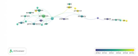 En la Figura 2, se muestra como el concepto más estudiado fue “Activation”, “inhibition” y “Gene-expression”, para el año 2018, y “Model”, “Prediction” y “Risk”, para el periodo 2019.