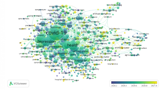 Sin embargo, en el año 2020, cobra relevancia una mayor cantidad de conceptos derivados del incremento de publicaciones generadas (Figura 3). Igualmente, el concepto más importante abordado por los diferentes estudios fue “Covid-19”, mientras que, otros conceptos secundarios reiterados en varias investigaciones se corresponden con “Health”, “Depression”, “Mortality”, “Prevalence”, y “Adolescents”. Además, los conceptos estudiados hacia finales del año 2021 fueron “Drinking power”, “Hospital cardiac-arrest”, y “Teachers”.
