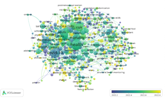 Por otra parte, los conceptos más relevantes para la fecha comprendida entre 2022-2023, se asocian con “Covid-19”, “Health”, “Depression”, “Mortality” y “Risk”. Como conceptos recientes cercanos hacia finales del año 2023, se muestran los conceptos de “Artificial intelligence”, “Sensors”, “Deep learning” y “Feature extraction”. Por tanto, va tomando fuerza los aspectos relacionados con la ciencia y la academia (Figura 4).