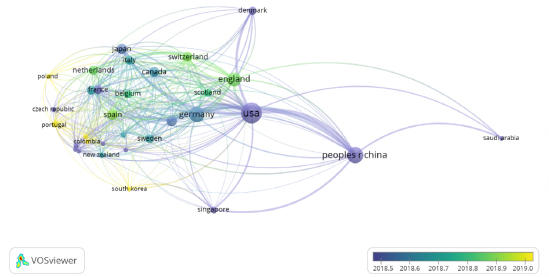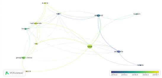 El estudio de los países que han venido desarrollando investigaciones relacionados con la educación y la salud evidencia como a través del tiempo ha masificado la participación de estos. Para la fecha analizada entre 2016-2017, se evidencia como sólo 12 países desarrollaron al menos 3 estudios sobre está temática (Figura 5). Siendo, Estados Unidos y China los países más representativos. También, se evidencia el trabajo colaborativo entre estados. Igualmente, se destaca como la mayoría de los países son del continente Europeo y Norteamericano, a excepción de China y Singapur.