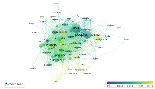 Para el año 2020 y 2021, la participación de los países se incrementa y la cantidad de documentos por cada país. Además, las instituciones más representativas son de Estados Unidos y China, así como toman fuerza otros países como Inglaterra, Australia, Alemania, Italia, España, Japón y Brasil (Figura 7).