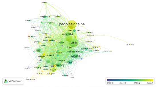 Finalmente, para los años más recientes (2022-2023), se evidencia que existe una red de cooperación académica bastante fortalecida liderada por Estados Unidos hacia principios de 2023. Igualmente, surgen otros países que están produciendo conocimiento sobre Educación y Salud como Guatemala, Camerún, México, Luxemburgo, Gales, Eslovaquia y Vietnam. Para este periodo de tiempo, se promueve la participación de países correspondientes a cada uno de los continentes, reflejando la importancia de esta temática como problemática mundial.