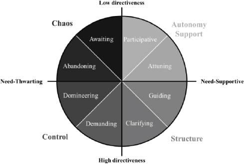 Besides the Circumplex Model’s graded approach, a second defining characteristic is its fine-grained approach. Each of the four broader quadrants (i.e., autonomy support, structure, control, and chaos) is subdivided into two more refined subareas (i.e., participative, attuning, guiding, clarifying, demanding, domineering, abandoning, and awaiting). This subdivision provides a more nuanced perspective, distinguishing between the specific (motivational) effect of each approach (Aelterman et al., 2019).
