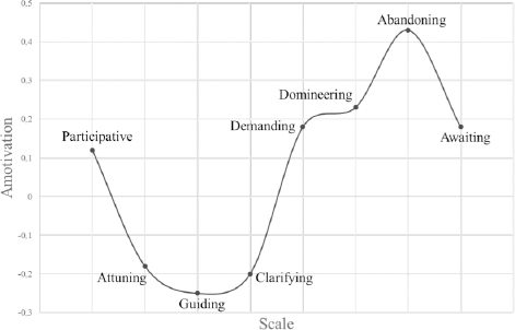 Said differently, the different need-supportive and need-thwarting approaches yield a sinusoidal pattern across outcomes. Specifically, the attuning and guiding approaches show the strongest correlations with desirable outcomes, and these correlations gradually decrease and become negative as one moves along the Circumplex toward the domineering and abandoning approaches. Similarly, the domineering and abandoning approaches show the strongest positive correlations with negative outcomes, and these correlations decrease and become negative when moving toward the attuning and guiding approaches (see Figure 2 for an example). It should be noted that the positive peak or negative drop is outcome-dependent (Aelterman & Vansteenkiste, 2023)