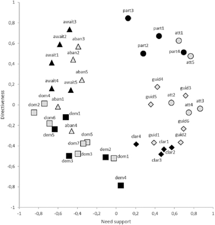 Note. Each point in the Figure represents a need-supportive or need-thwarting behavior. For example, “part 1” (= participative behavior one) entails the behavior offering option choice (see Supplementary Materials or Appendix 1: SIS-PE Coder of Van Doren et al., 2023). Part = participative, att = attuning, guid = guiding, clar = clarifying, dem = demanding, dom = domineering, aban = abandoning, await = awaiting