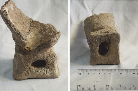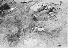 Figura 8.- Plataforma de arcilla fragmentada por desplome y cubriendo seis vasos de cerámica a mano.