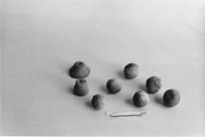 Figura 12.- Bolas aparecidas en el yacimiento junto a dos fusayolas.