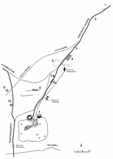 Figura 1. Distribución de las áreas cementeriales altoimperiales excavadas en Segobriga. 1.- Recintos funerarios Los Vallejos. 2.- Recintos funerarios La Pinilla. 3.- Recinto funerario. 4.- Necrópolis de las parcelas números 45 y 46. 5.- Recinto funerario Corral de la Virgen. 6. Mausoleos contiguos a la via sepulcralis septentrional. 7.- Basamento de un monumento funerario. 8.- Necrópolis noroccidental. 9.- Mausoleo de los Porcii. 10.- La denominada Tumba Monumental