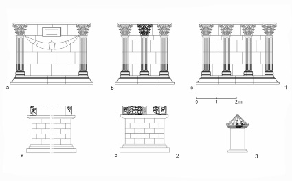 Figura 3. Formas arquitectónicas de los monumentos funerarios identificados en las necrópolis urbanas de Segobriga. 1.- La Tumba Monumental, un posible mausoleo de dos pisos (Cebrián, 2010, fig. 11, 146): a. cara frontal, b. cara lateral, c. cara posterior . 2.- Altar monumental (Noguera, 2012, fig. 64, 356): a. cara frontal, b. cara lateral. 3.- Monumento circular (Trunk, 2015, fig. 6, 330).