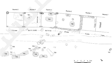 En esta necrópolis se reconocen seis recintos contiguos en el costado oriental de la vía funeraria principal, que discurrió por el fondo de un barranco natural, situada a 450 m del pomerium de la ciudad (figura 4). Al menos cuatro de estos recintos estuvieron delimitados por cipos -recintos nº. 2, 3, 4 y 5- con indicación de las medidas de los loca, que se sitúan entre los 375 pies y los 225 pies cuadrados. Se trata de estructuras a cielo abierto, rodeadas de muros bajos, construidos con zócalos de piedras y alzados de encofrado de tapial, cuya cronología se sitúa en la primera mitad del siglo I d. C. Dichos recintos no comparten medianeras pero sí un mismo muro de fachada, lo que evidencia su construcción de manera simultánea y sugiere una parcelación previa del terreno con una medida estándar de profundidad, de 4,45 m, y fines estrictamente funerarios.