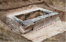 En las diversas áreas funerarias urbanas se reconocen otros enterramientos monumentales, aunque su tipología queda hoy por hoy desconocida debido al deficiente estado de conservación en el que se han hallado. Junto a los tres mausoleos de la necrópolis septentrional excavados en 2017 a los que ya nos hemos referido, conocemos otros tres edificios sepulcrales de obra. Uno de ellos se sitúa en la necrópolis occidental, el denominado mausoleo de los Porcii, que fue excavado en la década de los años 80 del siglo XX en el paraje Obradas de Gaspar, al O de la ciudad y al pie de la vía que se dirigía a Complutum (De la Rosa, 1988, 93-103). Presenta planta rectangular, de 7,60 m de longitud y 5,80 m de anchura, y está construido en opus quadratum. La fachada del monumento se abría a la vía a través de un vano de 4,48 m, en cuyo dintel de la puerta se situaron las dos inscripciones en las que se menciona a varios miembros de esta familia (Abascal et alii, 2011, nº 423, 344-345) y que se localizaron en su interior, reaprovechadas en las paredes de dos tumbas de inhumación de época tardorromana. El segundo enterramiento monumental procede también de la necrópolis septentrional y por su situación, a los pies del teatro, debe corresponder a uno de los monumentos funerarios más antiguos de la ciudad. De él, solo se conserva su basamento, de 6,98 m de fachada y 3,40 m de profundidad, realizado en sillería (Cebrián, 2014, 80). Por último, un tercer mausoleo se halló en la necrópolis noroccidental en el costado oriental de la vía funeraria principal. Se trata de una cimentación realizada en mampostería trabada con mortero, de 60 cm de anchura, que describe una U abierta a esta vía y presenta planta cuadrangular, de 4,45 m de lado (Cebrián y Hortelano 2016, 49).