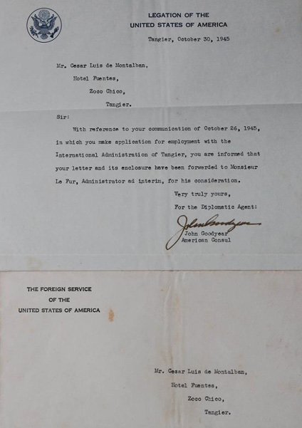 Fig. 10 Respuesta del cónsul de EEUU en Tánger a la petición de trabajo de César Montalbán, 30.X.1945 [A.M.]