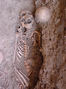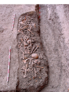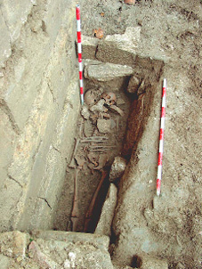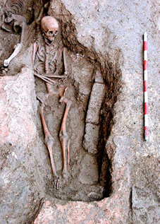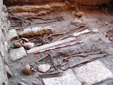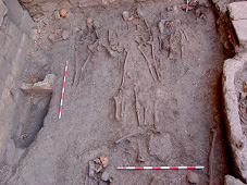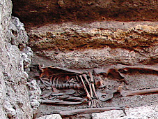 En lo que respecta a la colocación, se documentan también anomalías importantes. Los cuerpos aparecen en ocasiones con las piernas imperfectamente cruzadas o parcialmente flexionadas, con la columna vertebral anormalmente curvada, o con la cabeza caída post mortem hacia un lado. También existen casos en los que el cadáver se encuentra colocado en decúbito lateral parcial, tanto izquierdo como derecho (enterramientos nº 11, 33 y 71), sin que ello tenga relación alguna, por supuesto, con ritos de enterramiento islámicos (figura 25). Pero el caso más llamativo es, sin duda, el de un varón adulto que apareció en decúbito prono (enterramiento nº 26), lo que, en opinión del Dr. D. Juan Zozaya Stabel-Hansen, podría deberse a que el individuo en cuestión era un falso converso, hipótesis ciertamente verosímil en relación con el contexto sociorreligioso de la época (figura 26).