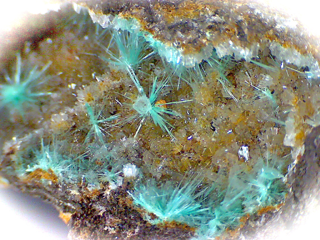Descripción: Agregados radiales de cristales aciculares en matriz de hemimorfita.