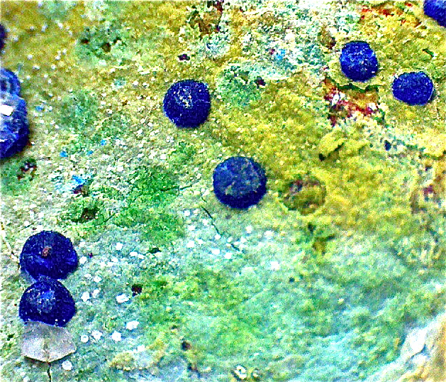 Descripción: Cristales esferulíticos de color azul sobre matriz de gilaita (verde)
