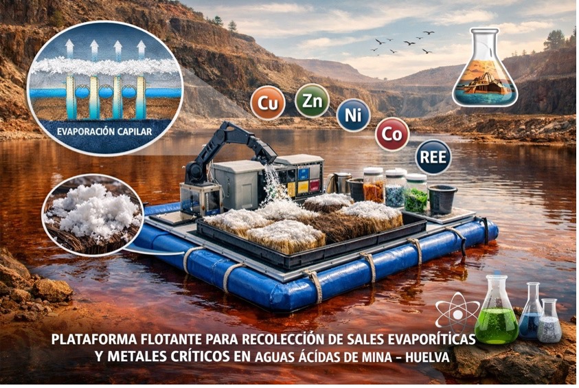 Este micro-proyecto propone el desarrollo de un prototipo de plataforma flotante de PVC equipada con fibras naturales y/o sintéticas para el cosechado y recolectado de sales evaporíticas generadas por evaporación y capilaridad de drenajes ácidos de mina (AMD) de la Provincia de Huelva. Dichas sales permitirán recuperar elementos críticos disueltos (Cu, Zn, Ni, Co, Tierras Raras, etc.) y explorar una alternativa sostenible para el tratamiento de aguas contaminadas en la Provincia de Huelva. Las cortas mineras inundadas y abandonadas de la Provincia de Huelva poseen en disolución una elevada carga de elementos metálicos en los que se incluyen elementos esenciales para la industria y la tecnología y de gran importancia económica y/o estratégica, los llamados elementos críticos. Las tecnologías actuales de tratamiento de este tipo de aguas tienen altos costes o baja recuperación de materiales valiosos. La evaporación capilar dirigida mediante fibras representa una opción innovadora y poco explorada en este contexto. El objetivo general del proyecto es diseñar, construir y validar en laboratorio un prototipo de plataforma flotante sobre la que se depositarán diferentes tipos de fibras que permitan concentrar y recolectar sales evaporíticas desde AMD generado en la provincia de Huelva con el fin de extraer metales críticos. Se propone finalizar el proyecto con un nivel de madurez tecnológico TRL3, lo que permitirá avanzar con su desarrollo en una corta minera hasta RTL6. Para ello se construirán prototipos de plataformas flotantes de PVC y distintos tipos de fibras que serán probadas en el laboratorio usando drenajes ácidos de cortas mineras de la provincia de Huelva. La ejecución del proyecto tendrá una duración de 7 meses iniciándose con el diseño y construcción del prototipo de la balsa y la selección de fibras. En laboratorio se realizarán ensayos de evaporación con fuente de luz infrarroja, recolección de sales y análisis químicos (ICP-MS) y mineralógicos (FESEM y DRX), finalizando con un análisis técnico-económico y ambiental del sistema.