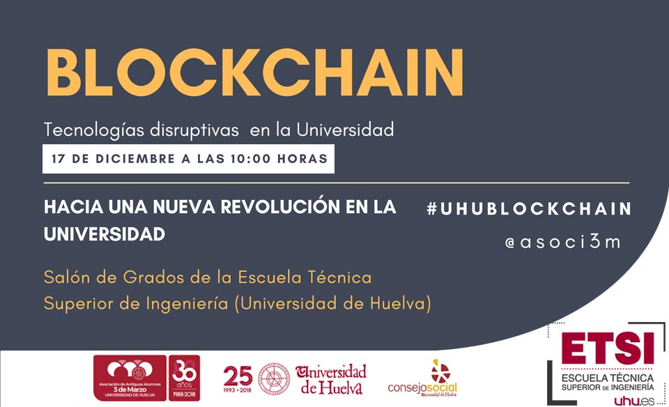 El próximo 17 de diciembre de 2018 a las 10:00h. se celebrará, en el Salón de Grados de la Escuela Técnica Superior de Ingeniería, el encuentro “Blockchain. Hacia una nueva revolución en la Universidad”, organizado por por la Asociación de Antiguos Alumnos de la Universidad de Huelva “3 de marzo”.