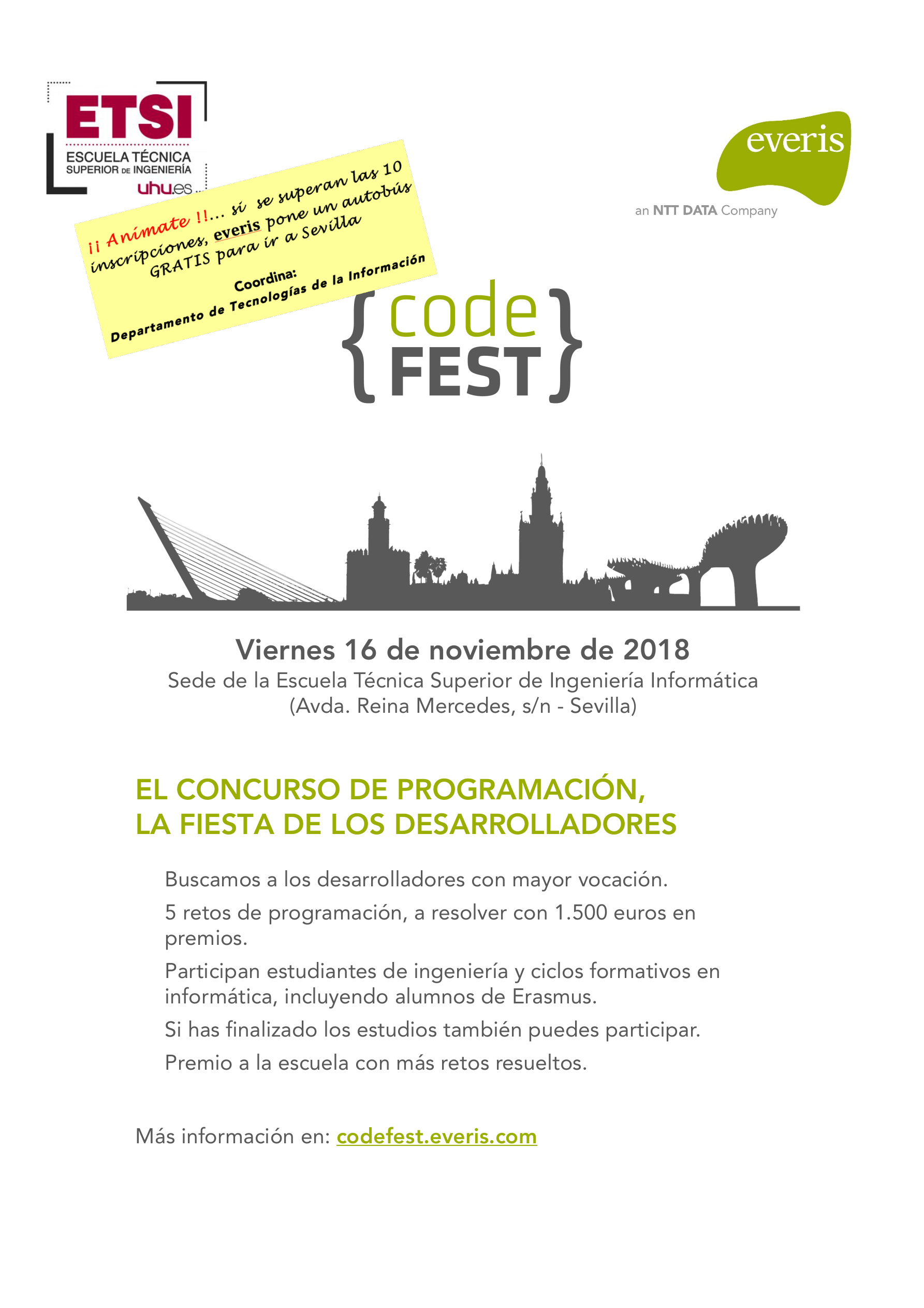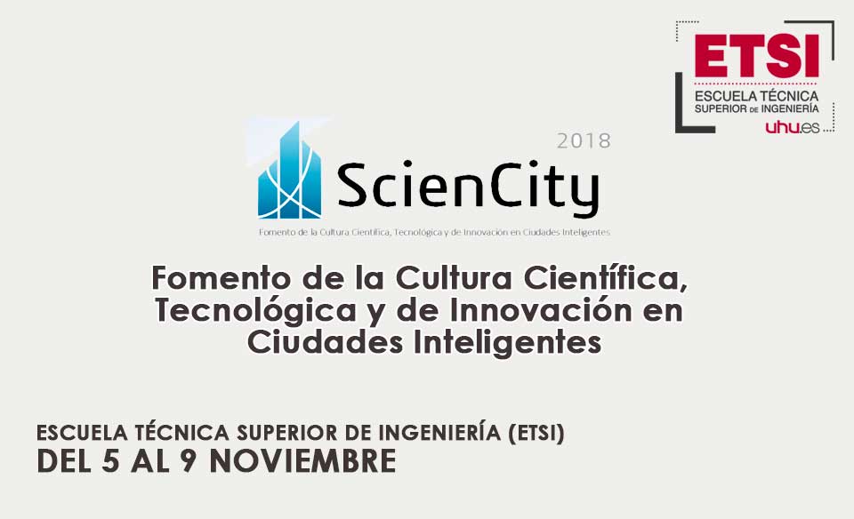 Del 5 al 9 de Noviembre se celebrará en la Escuela Técnica Superior de Ingeniería (ETSI) de la Universidad de Huelva las jornadas ScienCity 2018 con el título “Fomento de la Cultura Científica, Tecnológica y de Innovación en Ciudades Inteligentes” (http://eventos.uhu.es/23403).
