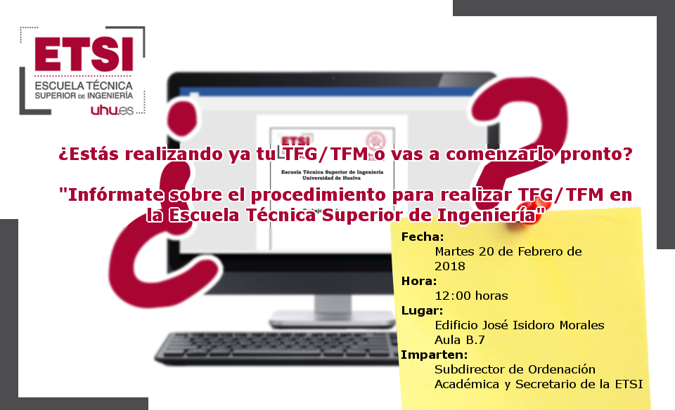 Es necesario que estés informado de todo lo relacionado con el TFG/TFM así que, por todo ello, es muy importante que acudas a la charla que se impartirá el próximo martes 20 de febrero de 2018 en el aula B.7 del edificio José Isidoro Morales a las 12:00 horas.