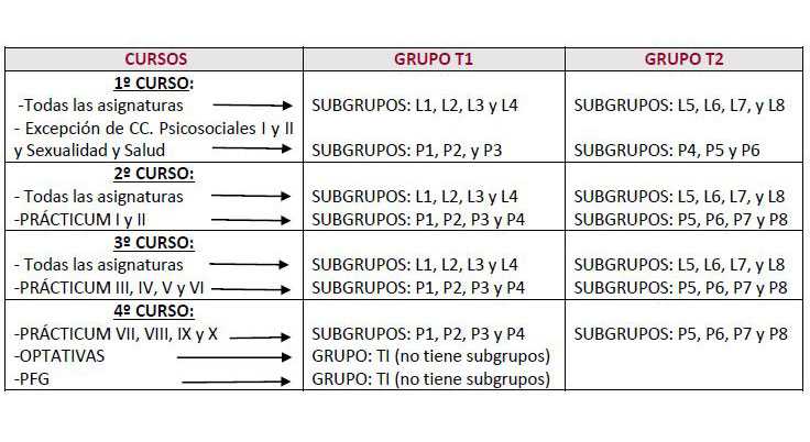 Los grupos T1 y T2 no corresponden a grupo de mañana y de tarde, ambos grupos tienen horarios de mañana y de tarde.